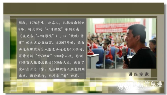 昆明信息港訊 9月9日晚,知名公益人士、昆明“心燈影院”(前身名為“心目影院”)創(chuàng)辦者——周權(quán),以一場題為“我的公益之路”的在線講座,在昆明理工大學(xué)藝術(shù)與傳媒學(xué)院新聞傳播系同學(xué)中引發(fā)熱烈反響。