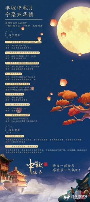 昆明信息港訊 記者合宇聰 記者從昆明市五華區(qū)豐寧街道辦事處獲悉,即日起至9月24日,豐寧街道辦將開(kāi)展主題為“豐收中秋月 · 寧聚五華情——我們的節(jié)日·中秋節(jié)”系列慶?;顒?dòng)。據(jù)了解,此次活動(dòng)將通過(guò)線上線下融合的方式舉辦,并融入月餅制作、中秋游園、猜等謎等傳統(tǒng)活動(dòng)及短視頻大賽等創(chuàng)新性線上活動(dòng),吸引轄區(qū)居民參與其中。