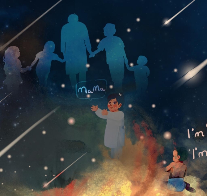 畫(huà)師在一片火光中重現(xiàn)幼兒生前的模樣:一個(gè)坐在地上嚷著“我兩歲,我不是恐怖分子”;另一個(gè)哭喊“媽媽”,伸出雙手要“抱抱”。