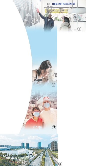 圖①:瓦沙亞(左)在地理信息科技館內(nèi)向參觀者介紹德清的地信產(chǎn)業(yè)。