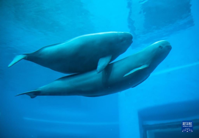 在位于武漢的中國科學(xué)院水生生物研究所,長江江豚媽媽和小江豚在水中游動(7月5日攝)。新華社記者 肖藝九 攝