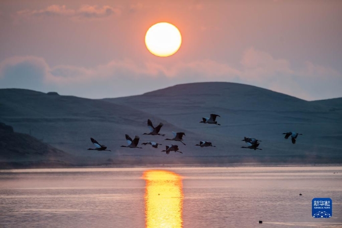 日出時分,黑頸鶴在云南省昭通市大山包黑頸鶴國家級自然保護區(qū)飛翔(2月25日攝)。新華社記者 胡超 攝