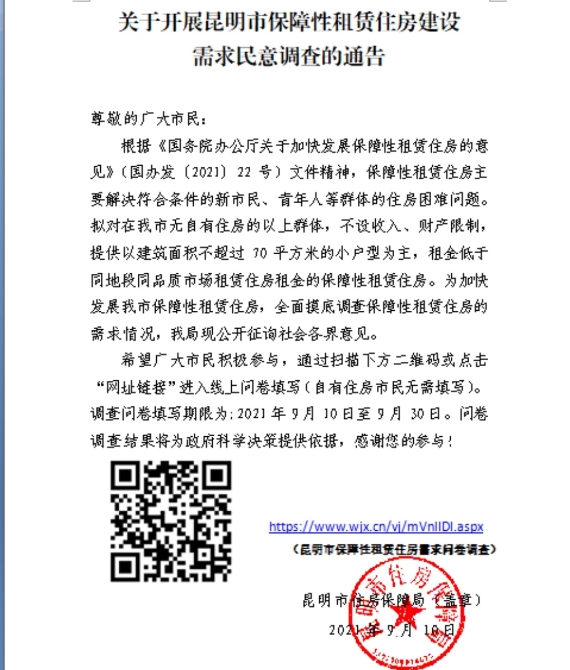 為加快發(fā)展昆明市保障性租賃住房,全面摸底調(diào)查保障性租賃住房的需求情況,昆明市住房保障局現(xiàn)公開征詢社會各界意見。