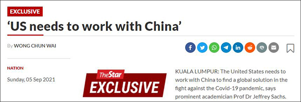 9月5日,國際醫(yī)學期刊《柳葉刀》雜志新冠委員會主席、美國經濟學家杰弗里·薩克斯(Jeffrey Sachs)在接受馬來西亞《星報》(The Star)獨家專訪時表示,中國在抗擊新冠疫情方面做得非常出色,世界本可以且應該能從中國的應對舉措中學到更多知識。他還呼吁美國需要與中國展開良好合作,而不是試圖強迫中國按照美國的意愿做事。