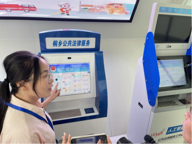 烏鎮(zhèn)司法所副所長郭蕓說,為滿足群眾快速獲得公共法律服務的需求,烏鎮(zhèn)司法所在人流密集處打造了“24小時法超市”,為有需要的群眾提供法律機器人問答、律師視頻解答、法律文書下載等“一站式”公共法律服務。