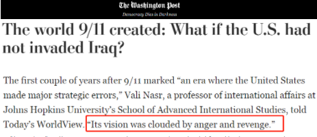 △《華盛頓郵報(bào)》:約翰斯·霍普金斯大學(xué)高級國際研究學(xué)院國際事務(wù)教授瓦利·納斯?fàn)栒J(rèn)為,“9·11”事件發(fā)生后的頭幾年標(biāo)志著“美國犯下重大戰(zhàn)略錯(cuò)誤的時(shí)代”,“它的愿景被憤怒和報(bào)復(fù)所籠罩”。
