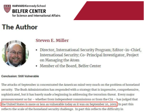 △哈佛大學(xué)肯尼迪政府管理學(xué)院貝爾福中心國際安全研究項(xiàng)目主任史蒂文·E·米勒發(fā)文指出,“9·11”事件讓美國人的注意力集中在“國土安全”問題上。但國土安全部的設(shè)立沒有解決任何問題。迄今為止,無論是來自獨(dú)立委員會還是來自CIA的重大聲明,都指出美國的今天與20年前一樣脆弱。