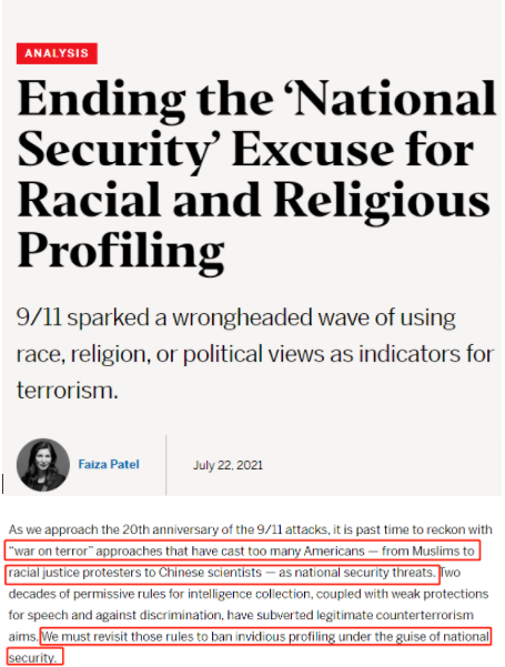 △紐約大學(xué)布倫南司法研究中心指出,美國的反恐方式已經(jīng)將太多美國人視為國家安全威脅。必須重新審視這些規(guī)則,禁止以國家安全為幌子對無辜者進(jìn)行令人反感的定性。