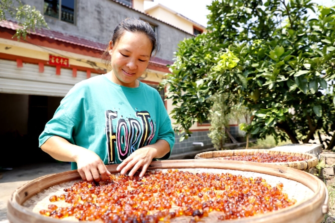 9月11日,江西省吉安市峽江縣金坪民族鄉(xiāng)新民民族村村民黃志秀在晾曬桃膠。陳福平攝