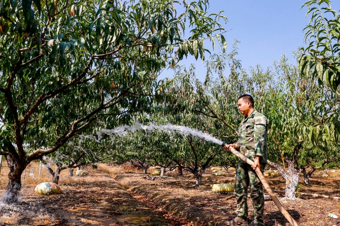 9月11日,江西省吉安市峽江縣金坪民族鄉(xiāng)新民民族村村民鄭馨貴在給桃樹澆水。陳福平攝