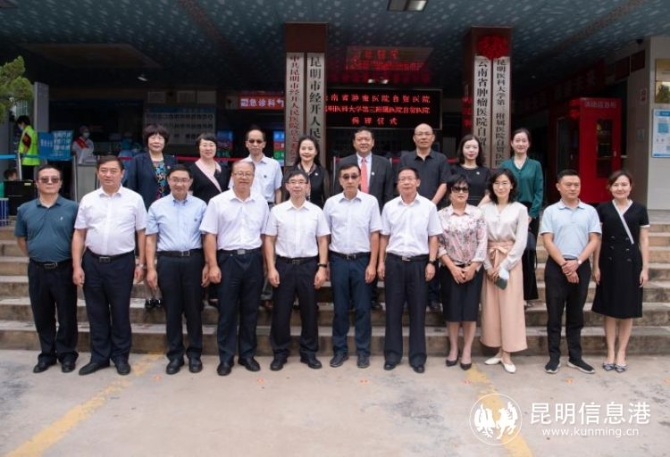 云南省衛(wèi)生健康委黨組書記許勇剛,昆明醫(yī)科大學(xué)黨委書記尹向陽,中國(云南)自貿(mào)區(qū)昆明片區(qū)(昆明經(jīng)開區(qū))管委會主任李河流,北京大學(xué)腫瘤醫(yī)院副院長邢沫,云南省腫瘤醫(yī)院、昆明醫(yī)科大學(xué)第三附屬醫(yī)院院長黃云超出席揭牌儀式并致辭,共同為自貿(mào)醫(yī)院揭牌。