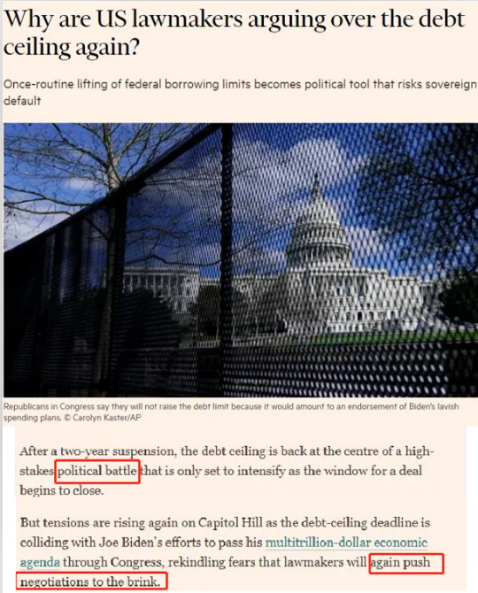 △英國《金融時報》:在暫停兩年之后,債務上限問題再次成為一場高風險政治斗爭的焦點。隨著提高債務上限的最后期限與拜登試圖在國會通過其數(shù)萬億美元經(jīng)濟議程的努力發(fā)生沖突,人們擔心議員們會再次將談判推向崩潰的邊緣。