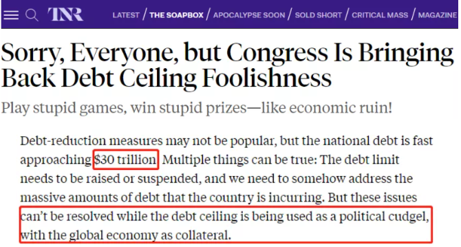美國《新共和》周刊發(fā)表評論文章,將民主、共和兩黨的債務上限之爭比作“愚蠢的游戲”,并斷言這場政治游戲最終會帶來經(jīng)濟的毀滅。