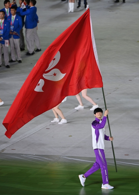 9月15日,香港特別行政區(qū)體育代表團(tuán)旗手歐智鋒在入場(chǎng)儀式上。新華社記者孫非攝