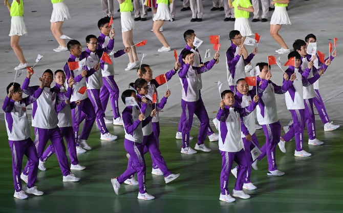 9月15日,香港特別行政區(qū)體育代表團(tuán)在入場(chǎng)儀式上。新華社記者孫非攝
