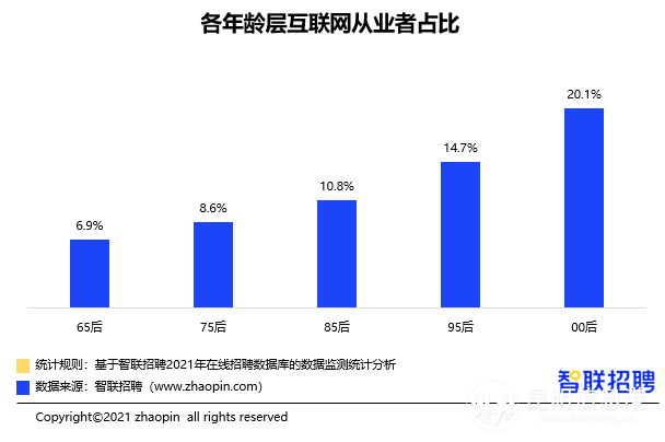 “Z世代”中,有14.7%的95后和20.1%的00后,從事IT/通信/電子/互聯(lián)網(wǎng)行業(yè),比例明顯高于95前各年齡層中從事互聯(lián)網(wǎng)行業(yè)的比例:65后(6.9%)、75后(8.6%)、85后(10.8%)。