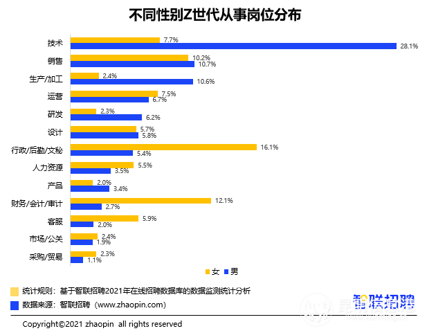“Z世代”男性中,管理者占比22.8%,高于“Z世代”女性管理者近10個百分點?!癦世代”男性員工的平均薪酬是6726元,比女性員工的平均薪酬5831元高出近1000元?!癦世代”女性主要分布在財務(wù)崗、行政崗,比例分別是16.1%、12.1%,而男性員工更多分布在技術(shù)崗,占比達到28.1%,技術(shù)崗女性員工比例僅為7.7%。