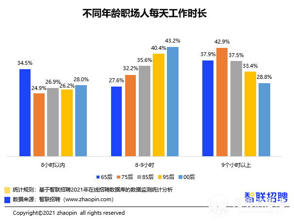 27.6%的95后、30.8%的00后對于工作的態(tài)度是:“追求理想,期待在工作中完成自我實現(xiàn)?!蓖贿x項,75后為35.5%,85后為33.7%。本次調(diào)研數(shù)據(jù)顯示,有2.2%的95后、3.4%的00后“常態(tài)化摸魚”,而75后和85后“常態(tài)化摸魚”的比例為1.7%和1.8%。工作并不是“Z世代”生活的全部,只有約3成“Z世代”員工每天工作超過9小時,相比之下,每天工作超過9小時的65后為37.9%,75后為42.9%,85后為37.5%。