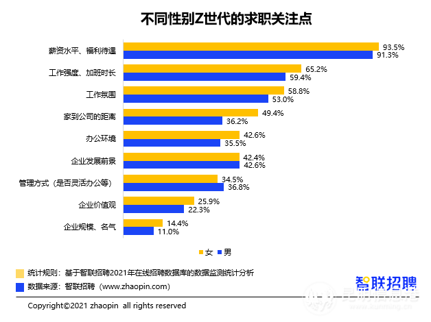 與其他代際人群一樣,“Z世代”在求職時最關(guān)注薪資水平、福利待遇。93.4%的95后關(guān)注薪資水平、福利待遇,該比例比00后高出近5個百分點??粗亍凹业焦镜木嚯x”的“Z世代”女性占比達到49.4%,而男性僅為36.2%。