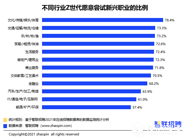智聯(lián)招聘近日發(fā)布《2021“Z世代”職場現(xiàn)狀與趨勢調(diào)研報告》,其中指出,“Z世代”又稱網(wǎng)絡(luò)世代,指1995-2009年間出生的一代人,被稱為“網(wǎng)絡(luò)原住民”的他們,依然喜歡“扎堆”互聯(lián)網(wǎng),他們比職場前輩更渴望高收入,同時期待個人成長,喜歡靈活就業(yè),并開始拋棄“分工明確”的固化職場,視頻博主和菜品體驗官是“Z世代”最向往的新興職業(yè)。