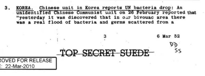 杰弗里·凱說,中情局這些文件來自美國武裝部隊安全局獲取并翻譯分析的中國和朝鮮通信。文件顯示,在對美方竊取情報手段毫不知情的情況下,中朝兩軍內(nèi)部曾通報過遭細菌戰(zhàn)打擊的實際情況。
