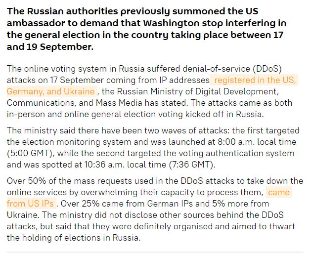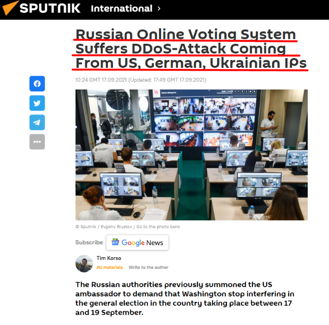 此前在18日,俄羅斯衛(wèi)星網也在報道中證實了這一點。報道稱,17日俄羅斯國家杜馬選舉首日,在線投票系統(tǒng)分別遭到來自美國、德國和烏克蘭IP地址的網絡攻擊。
