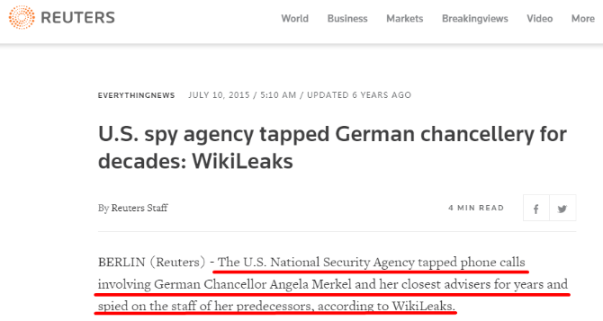 2015年,維基揭秘披露稱,美國國家安全局竊聽德國總理默克爾多年,對德國官員使用的125個電話號碼進行了長期監(jiān)聽,歷史上還曾對希拉克、薩科齊、奧朗德等多任法國總統(tǒng)搞監(jiān)聽。