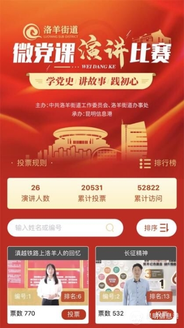 自9月14日活動(dòng)啟動(dòng)以來,受到了社會(huì)各界的關(guān)注。洛羊街道26名黨員以“學(xué)黨史·講故事·踐初心”為主題,結(jié)合黨和國(guó)家的大政方針、新理論新思想與工作實(shí)際、身邊典型、感人故事等進(jìn)行“微黨課”演講,并在網(wǎng)絡(luò)展示投票。各界友人踴躍投票支持自己喜愛的選手,為自己喜愛的選手助威。截至投票窗口關(guān)閉,大賽投票專欄累計(jì)點(diǎn)擊瀏覽超5萬(wàn)次,收到投票20531票。
