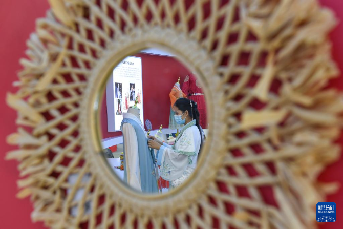 9月23日,在第十七屆文博會山東展臺,身著漢服的參展人員整理展示的漢服。新華社記者 毛思倩 攝