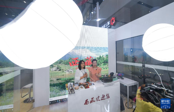9月23日,參展者在第十七屆文博會西藏展臺直播。新華社記者 毛思倩 攝