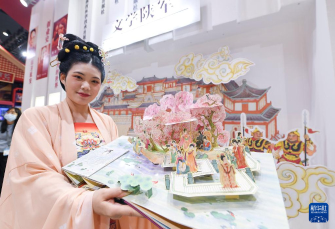 9月23日,盛裝的參展者在第十七屆文博會陜西展臺展示《大唐長安》立體書。新華社記者 毛思倩 攝