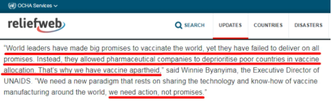 聯(lián)合國(guó)艾滋病規(guī)劃署執(zhí)行主任溫妮·拜恩伊瑪就此指出,一些國(guó)家的領(lǐng)導(dǎo)人做出了為全世界接種疫苗的承諾,但他們并未兌現(xiàn)承諾。相反,他們?cè)试S制藥公司在疫苗分配上不優(yōu)先考慮窮國(guó)?!斑@就是為什么我們有‘疫苗種族隔離’。我們需要的是行動(dòng),而不是承諾”。