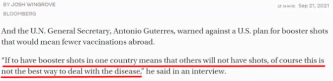 報(bào)道援引聯(lián)合國(guó)秘書(shū)長(zhǎng)古特雷斯的話說(shuō),“如果在一個(gè)國(guó)家注射疫苗加強(qiáng)針意味著其他國(guó)家不能注射疫苗,這當(dāng)然不是應(yīng)對(duì)這種疾病的最佳方法”。