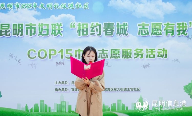 昆明市婦聯(lián)調(diào)研員萬星憲、宣傳部部長戴張溶、官渡區(qū)婦聯(lián)主席呂瑜等相關(guān)領(lǐng)導(dǎo)參加活動。萬星憲調(diào)研員為活動致辭,并宣布活動正式開始?!袄ッ髯鳛闁|道主的一分子,為充分展現(xiàn)東道主的美好形象,體現(xiàn)新時代女性的時代素養(yǎng)和文明追求,衷心希望各位姐妹們能夠積極響應(yīng)黨委、政府的號召,做文明昆明人,彰顯東道主的文明素養(yǎng)、展現(xiàn)春城女兒良好形象、凸顯都市女性的品格魅力,體現(xiàn)春城姐妹的生態(tài)擔(dān)當(dāng)?!比f星憲指出,每一位巾幗志愿者都應(yīng)自覺做生態(tài)環(huán)境保護(hù)的倡導(dǎo)者、行動者、示范者,從身邊點(diǎn)滴做起,攜手守護(hù)生物多樣性,以良好風(fēng)貌迎接COP15。