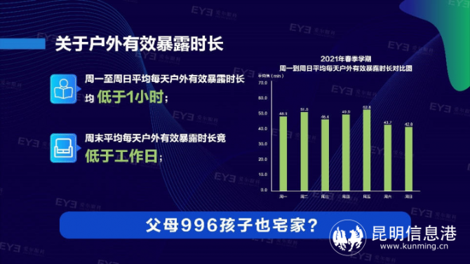 科學(xué)研究表明,戶外活動(dòng)是近視眼的一個(gè)獨(dú)立性保護(hù)因素。每天2小時(shí)、每周10小時(shí)以上的戶外活動(dòng),可以讓青少年的近視發(fā)生率降低10%以上。而從《報(bào)告》數(shù)據(jù)上卻發(fā)現(xiàn),這些學(xué)生周一至周日平均每天有效戶外暴露時(shí)長(zhǎng)均低于1小時(shí),特別是周末,平均每天戶外有效暴露時(shí)長(zhǎng)竟比在學(xué)校時(shí)還少。