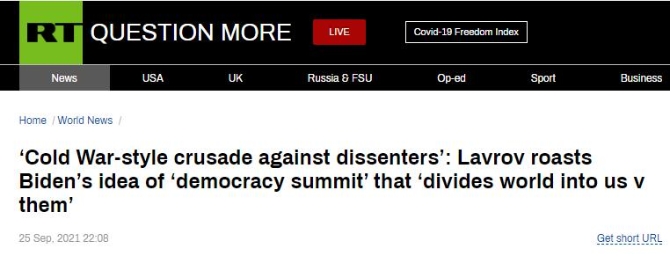 報道稱,今年8月,美國總統(tǒng)拜登提出召集舉辦一個“民主峰會”的想法。而對這一提議,RT表示,俄羅斯外長拉夫羅夫認(rèn)為這是美國目前實(shí)施分裂政策的一個明顯例證。