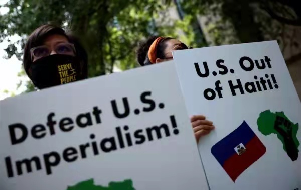 △莫伊茲遇刺后,和平人士在美國國務(wù)院外集會,打出“美國滾出海地”“打倒美帝國主義”等標語,反對美國干涉海地內(nèi)政。