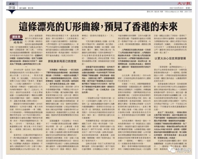 香港《大公報(bào)》今日刊發(fā)靖海侯專欄文章。3000多字,半個(gè)版面,聚焦這條"U形曲線”,對(duì)香港兩年來(lái)走過(guò)的路進(jìn)行了探究。香港變化之源、變化之力、持續(xù)變化之可能,文章均給出了分析。