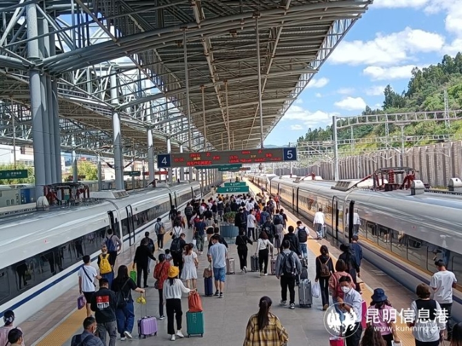昆明信息港訊 記者上官艷君 9月28日,記者從中國鐵路昆明局集團(tuán)有限公司(下稱“昆明局集團(tuán)”)獲悉,今年國慶黃金周鐵路運輸期限為9 月 28 日至10 月 8 日,共計 11 天。昆明局集團(tuán)將實行高峰圖運行,預(yù)計發(fā)送旅客220萬人次,日均20萬人次。