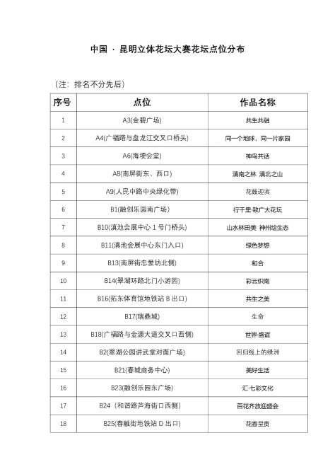據(jù)了解,100組花壇分布于滇池國際會展中心片區(qū)、滇池海埂片區(qū)、歷史文化片區(qū)、市級行政中心片區(qū),以及機(jī)場高速、滇池路、廣福路、東風(fēng)路、北京路、彩云路、機(jī)場路、火車南站等昆明市重要的片區(qū)、道路和節(jié)點(diǎn),展現(xiàn)著云南生物多樣性保護(hù)的成果,展示著極具魅力的云南特色。恰逢國慶節(jié)將至,組委會為大家列出了“賞花壇地圖”(100個點(diǎn)位詳見附件),誠邀市民朋友們到各個點(diǎn)位觀賞拍照,與各色彩豐富、造型獨(dú)特的花壇來一場美麗的邂逅。