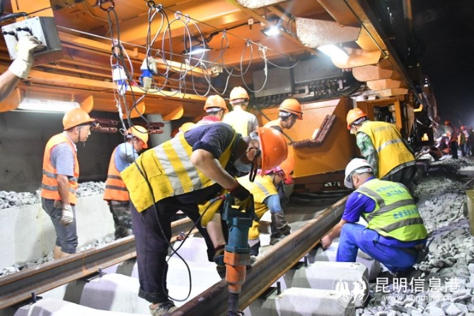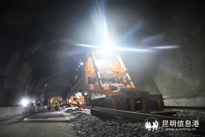 昆明信息港訊 記者上官艷君 10月5日,在位于云南省景洪市境內(nèi)的中(國)老(撾)昆(明)萬(象)鐵路景寨隧道內(nèi),隨著現(xiàn)場負(fù)責(zé)人的一聲令下,CPG500型鋪軌機(jī)將一對500m長鋼軌鋪設(shè)到景寨隧道整體道床上,開啟了中老鐵路國內(nèi)段最后26公里鋪軌的沖刺。