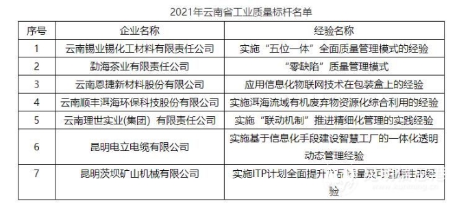 昆明信息港訊 記者戴云 近日,省工業(yè)和信息化廳公布2021年云南省工業(yè)質(zhì)量標(biāo)桿名單的通知。根據(jù)通知,云南7家企業(yè)榮獲2021年“工業(yè)質(zhì)量標(biāo)桿”。