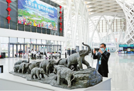 會(huì)場(chǎng)大廳陳列的主題群象雕塑