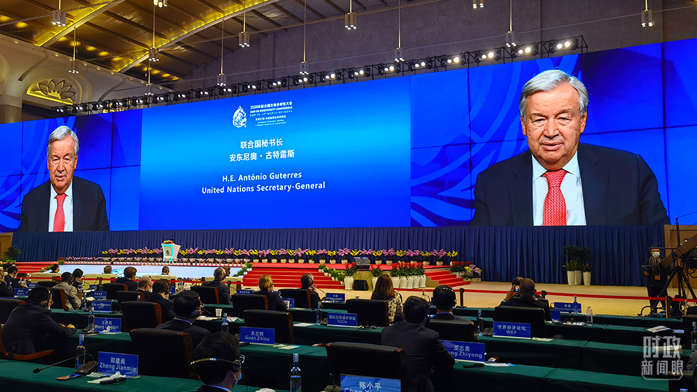 聯(lián)合國秘書長古特雷斯通過視頻方式致辭。(總臺央視記者舒貝拍攝)