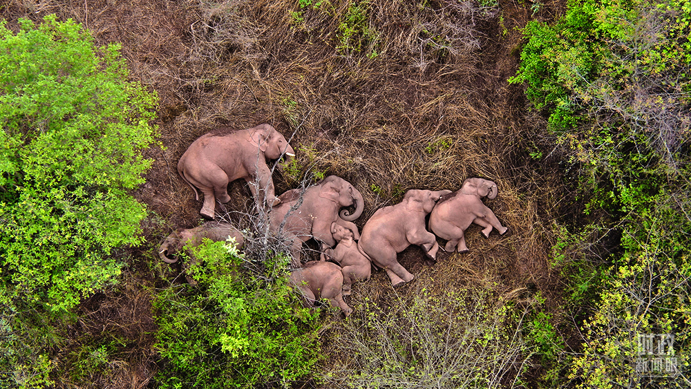 2021年6月7日,云南省森林消防總隊(duì)的無人機(jī)監(jiān)測人員觀測到野象群暫停遷徙的一幕。這是監(jiān)測野象12天來,第一次發(fā)現(xiàn)象群集體躺著睡覺。(圖/視覺中國)