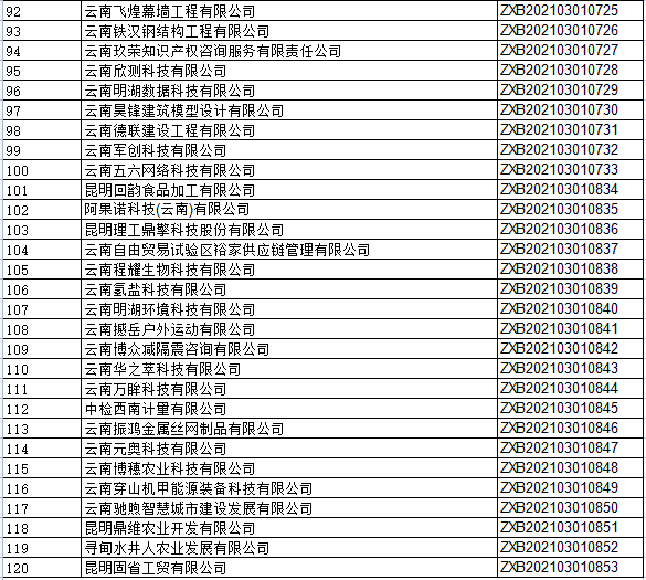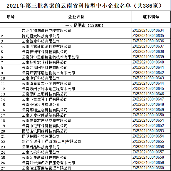 昆明信息港訊 實(shí)習(xí)記者張水燕 10月12日,云南省科技廳發(fā)布2021年第三批備案云南省科技型中小企業(yè)名單。共有386家企業(yè)通過(guò)審核,昆明市有120家,玉溪市有90家,臨滄市有75家,楚雄市有25家,麗江市有13家,德宏州有11家,紅河州、普洱市有8家,大理州有7家,文山州有5家,昭通市有4家,迪慶州、保山市、曲靖市有3家,怒江州有1家。
