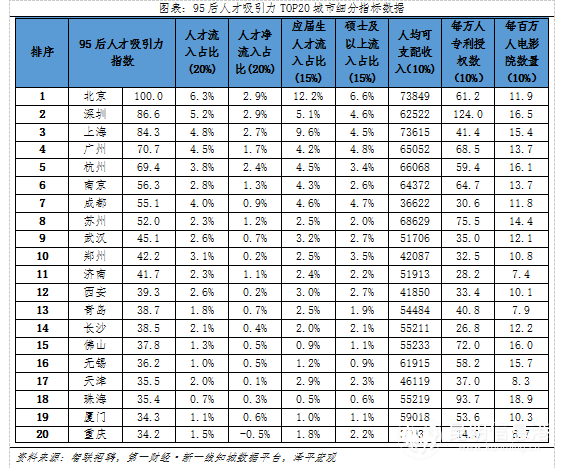 95后人才吸引力指數(shù),以人均可支配收入、每萬(wàn)人專(zhuān)利授權(quán)數(shù)量和每百萬(wàn)人電影院數(shù)量為外部指標(biāo),疊加智聯(lián)招聘提供的95后人才流入占比、95后人才凈流入占比、95后應(yīng)屆生人才流入占比、95后碩士及以上人才流入占比四個(gè)內(nèi)部指標(biāo)構(gòu)建。