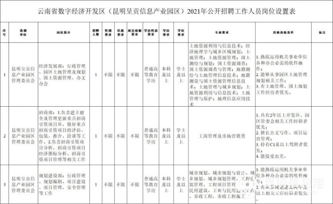 昆明信息港訊 記者張楠 10月13日,昆明呈貢信息產業(yè)園區(qū)管理委員會發(fā)布公告,公開招聘工作人員3名。本次招聘涉及經濟發(fā)展部、招商部和規(guī)劃建設部共計3個崗位。報名時間為2021年10月18日上午9:00至10月22日下午17:00,共5天,逾期不再受理任何報名。