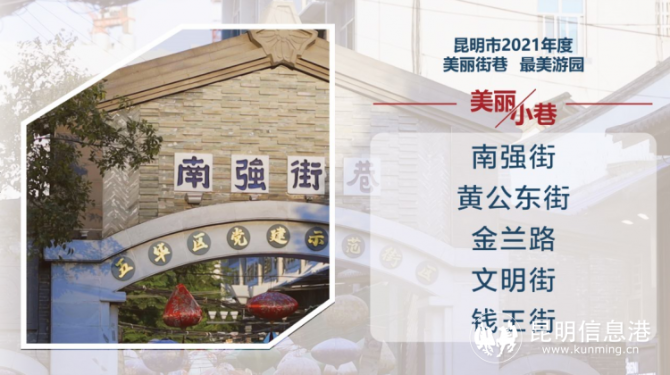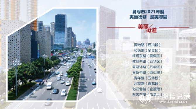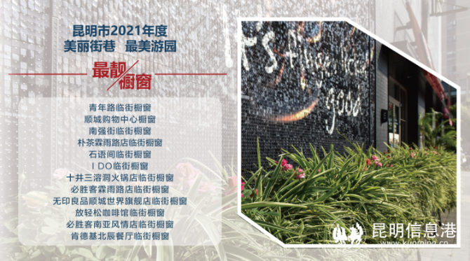 獲得“美麗街道”的有滇池路(西山段)、和諧路(呈貢區(qū))、紅塔東路(度假區(qū))、教場(chǎng)中路(五華區(qū))、翠湖環(huán)路(五華區(qū))、日新中路(西山段)、青年路(五華段)、北京路(盤龍段)、彩云北路(官渡段)、東風(fēng)東路(盤龍段)。獲得“美麗小巷”的有南強(qiáng)街、黃公東街、金蘭路、文明街、錢王街。獲得“最美游園”的有金碧公園、星光玉蘭園、環(huán)城北路小游園、晨露園、席子營(yíng)小游園。獲得“最美店招大街”的是北京路、人民路。獲得“最靚櫥窗”的包括青年路臨街櫥窗、順城購(gòu)物中心櫥窗、南強(qiáng)街臨街櫥窗、樸茶霖雨路店臨街櫥窗、石語(yǔ)間臨街櫥窗、I Do臨街櫥窗、十井三溶洞火鍋店臨街櫥窗、必勝客霖雨路店臨街櫥窗、無(wú)印良品順城世界旗艦店臨街櫥窗、放輕松咖啡館臨街櫥窗、必勝客南亞風(fēng)情店臨街櫥窗、肯德基北辰餐廳臨街櫥窗。