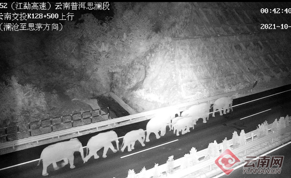 這樣不尋常的夜晚很快又在思瀾高速公路上演。10月13日零點(diǎn)40分,思瀾監(jiān)控分中心工作人員發(fā)現(xiàn)下行線K127+405處有一群影子在晃動(dòng),拉近視頻一看,原來是9頭大象在“路巡”。按照應(yīng)急預(yù)案流程,云南交投普洱管理處瀾滄分處立即啟動(dòng)交警、森林公安、林業(yè)和草原局等相關(guān)部門的大象保護(hù)聯(lián)動(dòng)機(jī)制,交警、龍?zhí)端砉苷玖⒓闯鰟?dòng)人員到思瀾高速入口處進(jìn)行交通管制,確保人象安全。